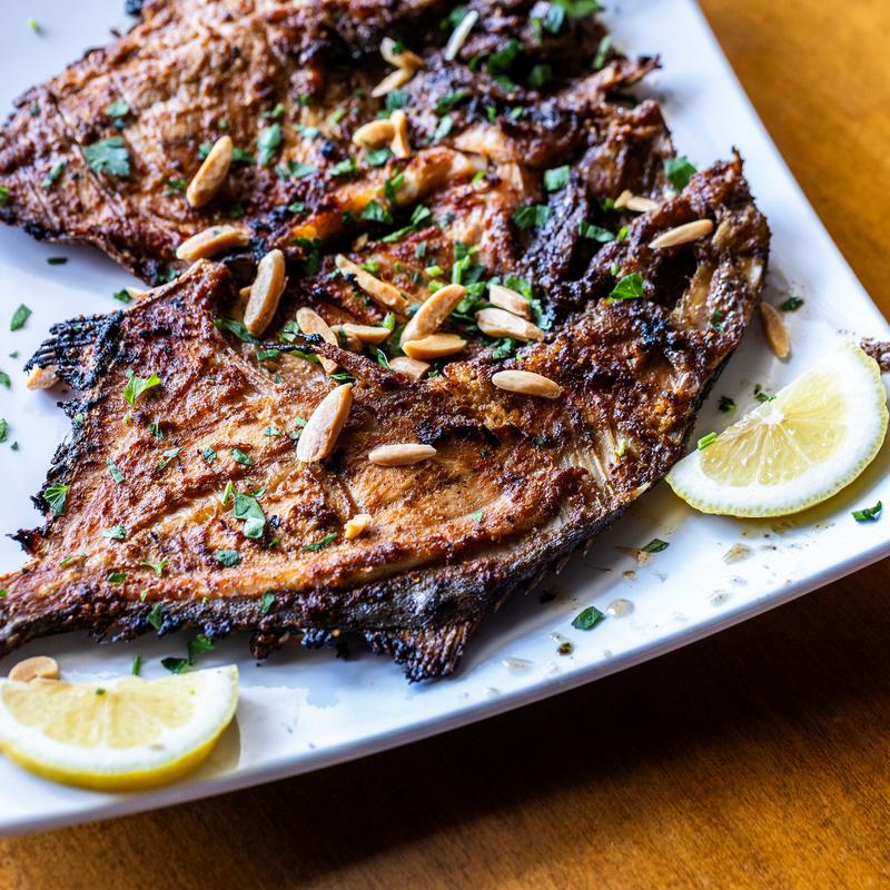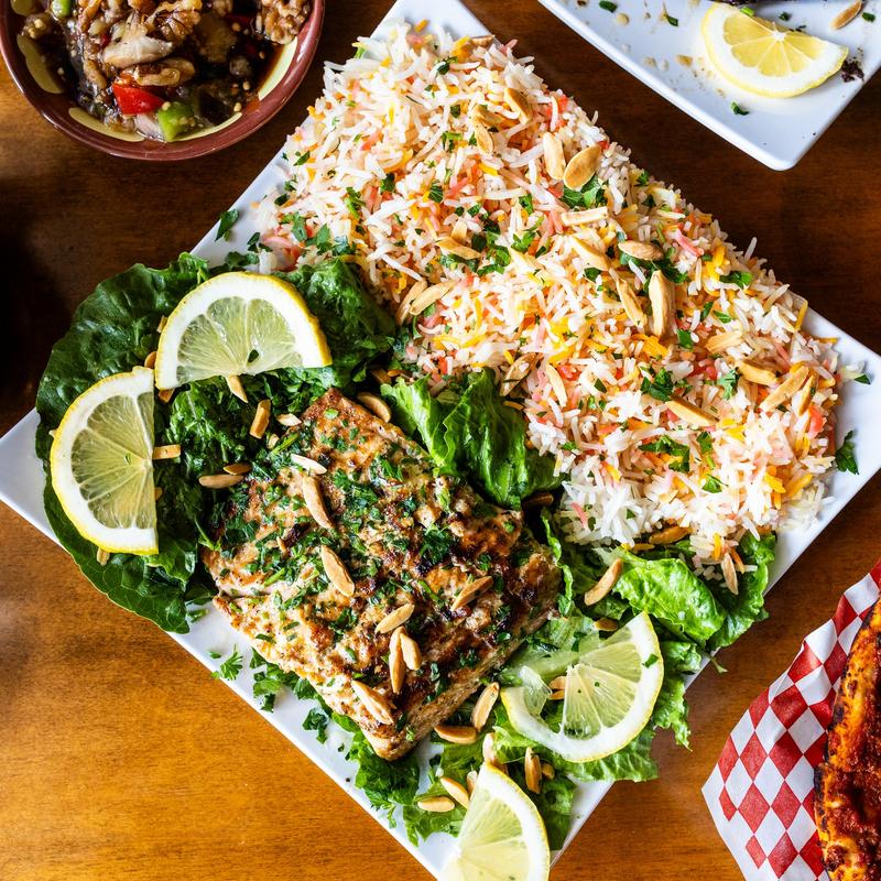 Grilled salmon marinated with lemon juice, garlic, and olive oil, served with tahini sauce & rice.