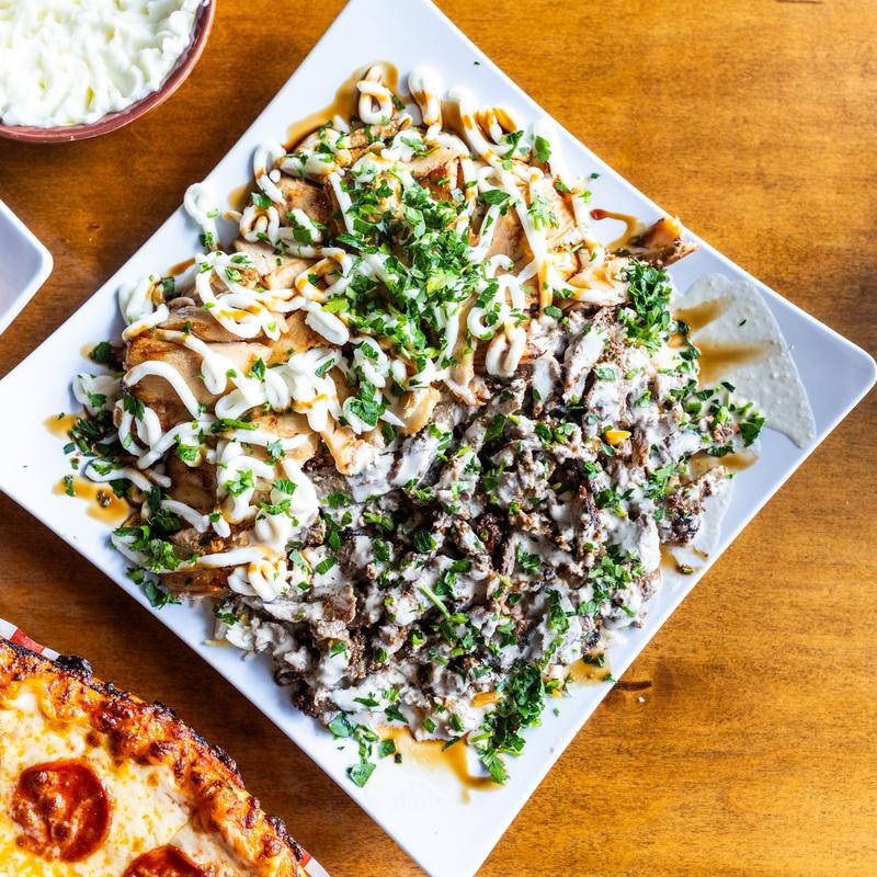 Succulent layers of lamb & beef and succulent layers of chicken served with rice, grilled tomatoes, and onions. Includes 1 cup of garlic sauce and tahini sauce.