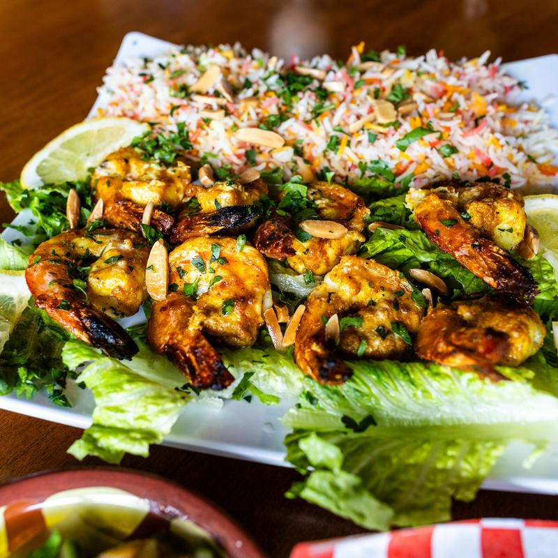 1/2 red rice | 1/2 yellow rice • 8 jumbo shrimp kabab marinated with butter sauce, garlic, and an array of spices.
